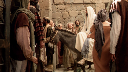 Jesus enters riding on a colt or donkey instead of a horse, a sign of a royal messiah or king.